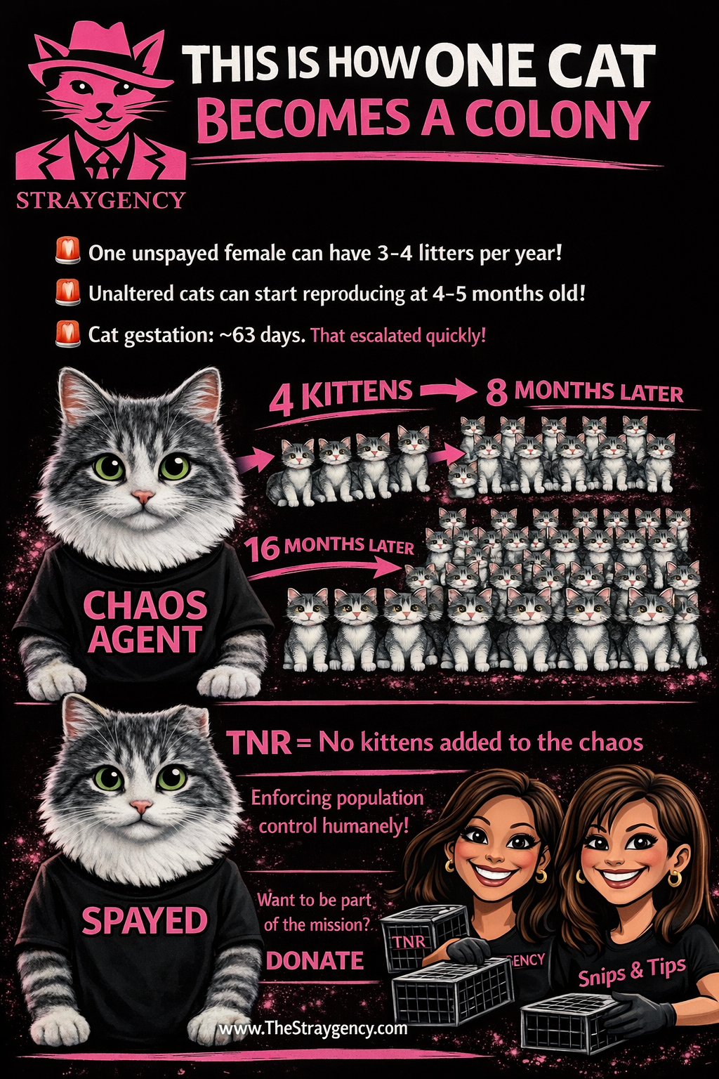 Our mission is simple: reduce the free-roaming cat population humanely and sustainably through Trap–Neuter–Return and adoption. TNR is the most effective way to protect outdoor cats and prevent the endless cycle of litters, suffering, and euthanasia. We do not release cats that show they have indoor pet potential.